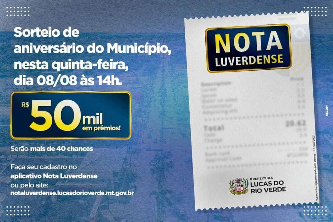Na próxima quinta-feira, dia 08 de agosto, acontecerá mais um sorteio da Campanha Nota Luverdense. O sorteio em comemoração ao aniversário da cidade será no dia 08 de agosto, na Prefeitura de Lucas do Rio Verde, às 14h.