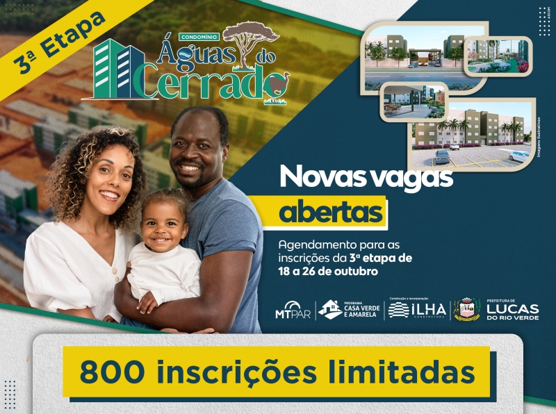 A Prefeitura de Lucas do Rio Verde, por meio da Secretaria Municipal de Assistência Social e Habitação, informa que já está disponível o link para o agendamento das inscrições da terceira etapa do Condomínio Águas do Cerrado.