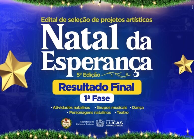 A Prefeitura de Lucas do Rio Verde, por meio da Secretaria de Cultura e Turismo, divulgou nesta terça-feira (28) o resultado final da primeira etapa dos projetos inscritos no Edital de Chamamento Público nº 06/2025, que selecionará produções artístico-culturais para compor o programa cultural da 5ª edição do Natal da Esperança.