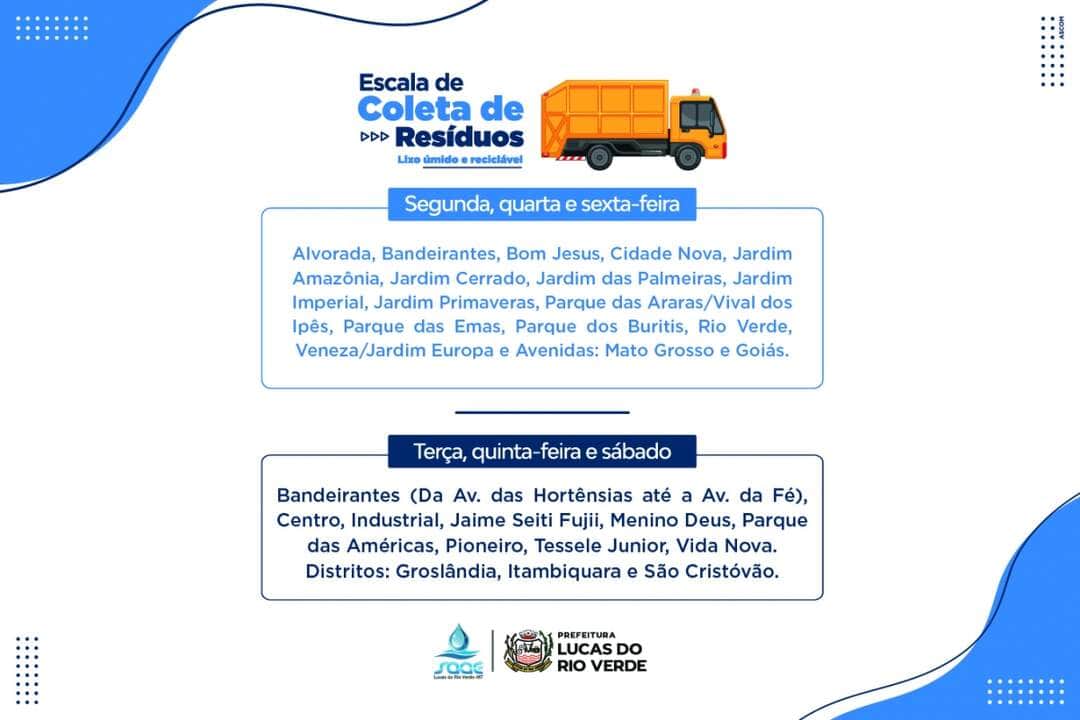 A Prefeitura de Lucas do Rio Verde segue empenhada em manter a cidade limpa e bem cuidada a partir dos serviços de coleta de resíduos, realizada pelo Serviço Autônomo de Água e Esgoto (SAAE), e da limpeza urbana, realizada pela Secretaria de Infraestrutura e Obras. Para isso, é necessário que todos os cidadãos luverdenses ajam com responsabilidade no momento de descartar os seus resíduos.