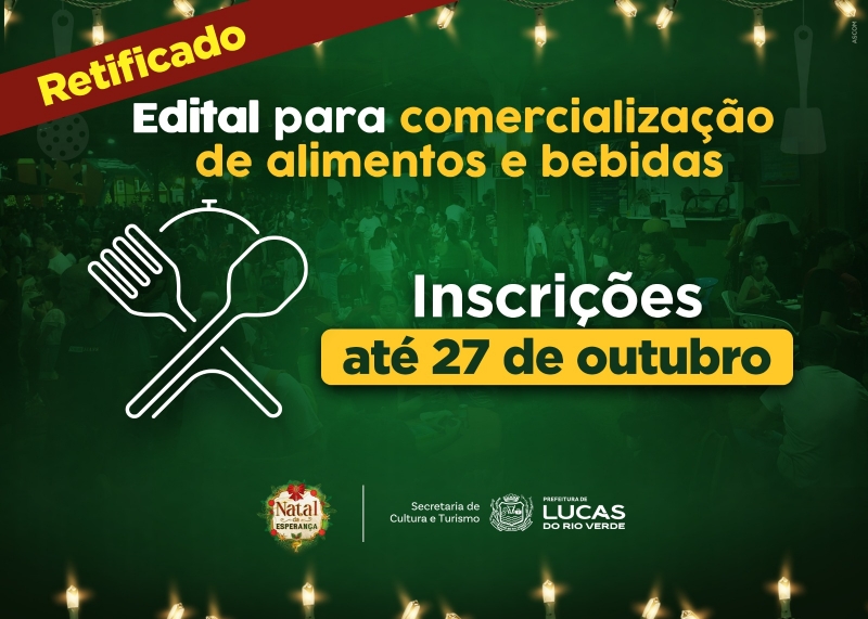 A Prefeitura de Lucas do Rio Verde, por meio da Secretaria de Cultura e Turismo, divulgou a Retificação nº 01 do Edital nº 007/2025, que trata da seleção de pessoas jurídicas interessadas na autorização de uso de espaço e estrutura pública para comercialização de alimentos e bebidas na praça de alimentação do evento “Natal da Esperança 2025”.