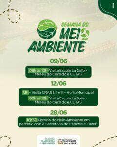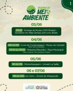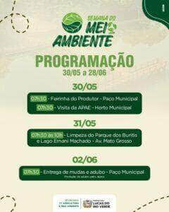 A programação contará com limpeza do Parque dos Buritis e Lago Ernani José Machado, no dia 31 de maio, a partir das 7h30. Na segunda-feira (02), haverá distribuição de mudas e adubo na Prefeitura de Lucas do Rio Verde a partir das 7h30.