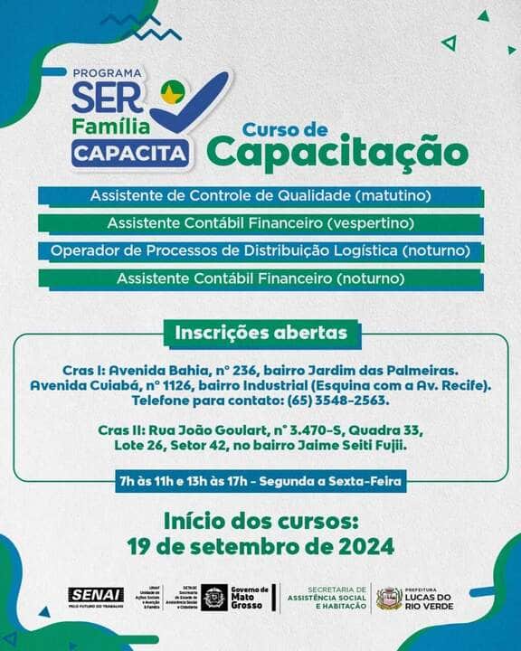 Estão abertas inscrições para quatro cursos gratuitos do Ser Família Capacita, do Governo de Mato Grosso. A iniciativa, que conta apoio da Secretaria de Assistência Social e Habitação de Lucas do Rio Verde e Senai-MT, é voltada para as pessoas cadastradas no CadÚnico.
