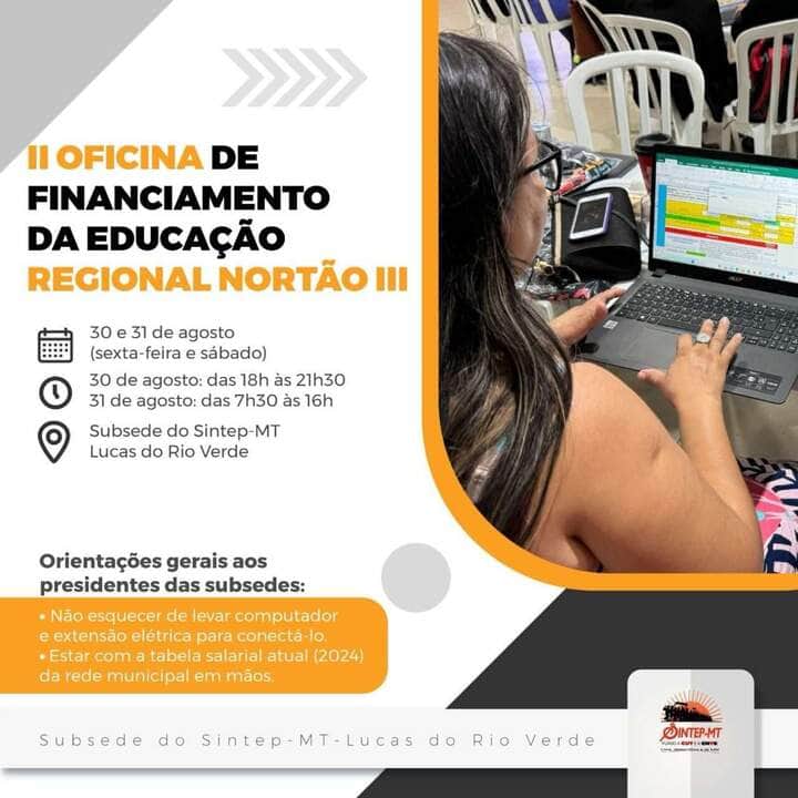 Nos dias 30 e 31 de agosto de 2024, o SINTEP (Sindicato dos Trabalhadores no Ensino Público) Subsede de Lucas do Rio Verde promoverá a 2ª Oficina de Financiamento da Educação da Regional Nortão III. O evento será realizado nas dependências da subsede local, reunindo lideranças sindicais e educadores da região para debater as políticas de financiamento da educação básica.