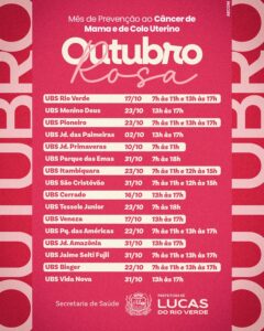 Durante o mês de outubro, a Prefeitura de Lucas do Rio Verde, por meio da Secretaria Municipal de Saúde, realiza uma programação especial voltada à prevenção e ao cuidado com a saúde da mulher.