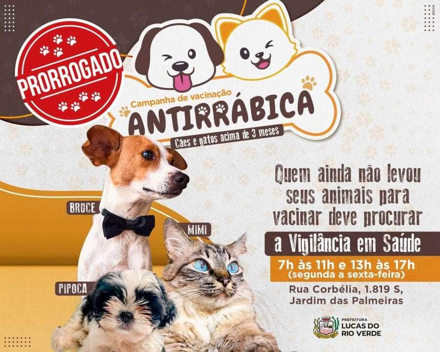 Para quem ainda não levou seu cão e/ou gato para vacinar contra a raiva, a Prefeitura de Lucas do Rio Verde anuncia que a imunização antirrábica foi prorrogada. Os interessados devem procurar a Vigilância em Saúde, de segunda a sexta-feira, das 7h às 11h e das 13h às 17h.