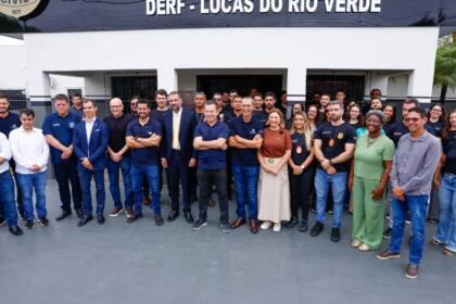 A comitiva estadual participou da inauguração da nova sede da Delegacia Especializada de Roubos e Furtos (DERF) de Lucas do Rio Verde. A unidade foi instalada em imóvel cedido pela Prefeitura, que também custeou integralmente as obras de reforma e adequações estruturais, iniciadas em julho de 2025, com investimento total de R$ 629 mil. A Polícia Civil foi responsável pelo fornecimento de 100% do mobiliário e equipamentos.