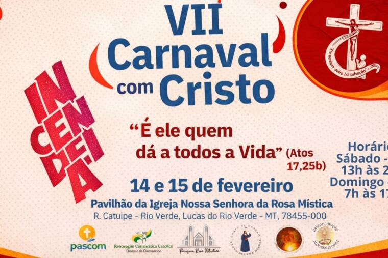 O ‘VII Carnaval com Cristo – Incendeia 2026’ será realizado no próximo final de semana, nos dias 14 e 15 de fevereiro, no Salão Paroquial da Matriz Rosa Mística, em Lucas do Rio Verde, reunindo fiéis para dois dias intensos de espiritualidade, oração e vivência cristã durante o período de Carnaval. O evento contará com pregadores vindos de outras cidades de Mato Grosso, como Cuiabá e Juína.