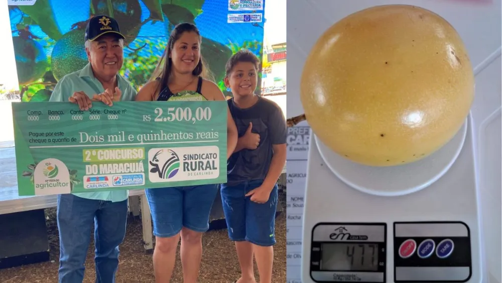 Um maracujá gigante de 477 gramas, quase meio quilo, foi o destaque da 19ª Festa do Agricultor, realizada nos dias 26 e 27 de julho em Carlinda. O enorme fruto, cultivado pelo casal Tainara Franciele da Silva e Ezivelton Barbosa, garantiu a eles o primeiro lugar no 2º Concurso do Maracujá da cidade.