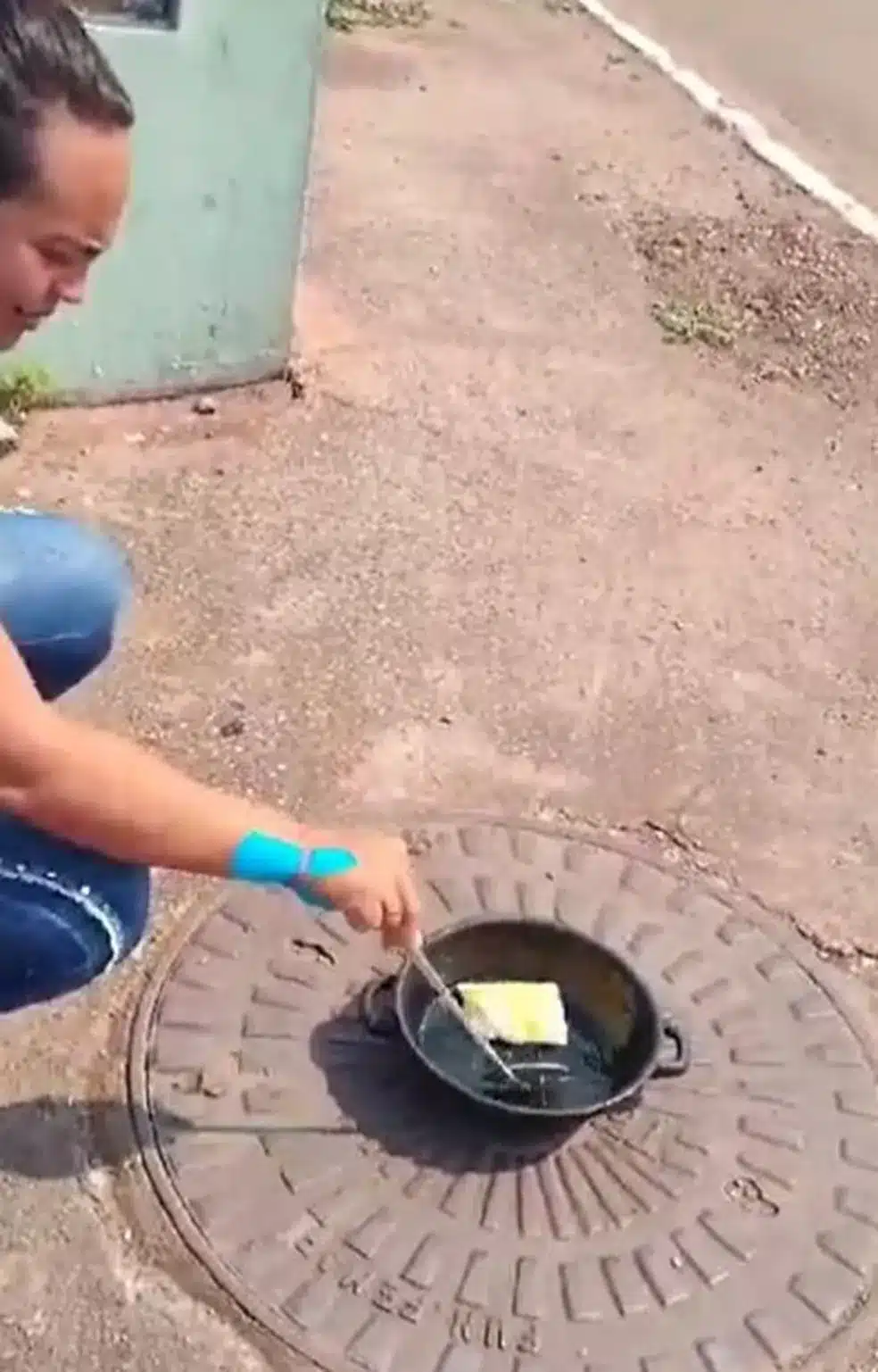 Diante disso, vários vídeos com pessoas ironizando o calor gigantesco surgiram nas redes sociais e se espalharam na web. Em um deles, uma moradora identificada como Fabiane Batista dos Santos, de 36 anos, fritou um pastel na calçada de casa, nesta sexta-feira (25) no município de Jangada, a 82 km de Cuiabá.