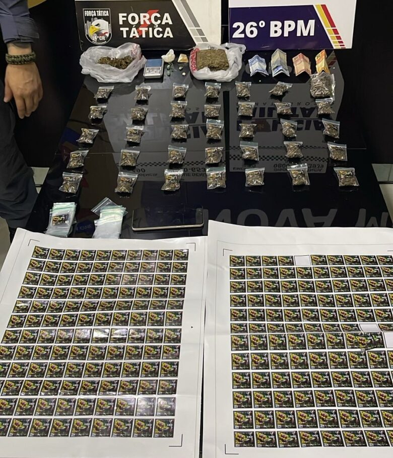Dentro da residência, os policiais encontraram diversos adesivos com inscrições como “tropa do cara-cracha CV, Mutum tá 2”, além de uma mochila contendo várias porções de drogas, invólucros plásticos, cartelas de adesivos com valores de R$ 50 e R$ 100, porções prontas para o embalo e uma balança de precisão.