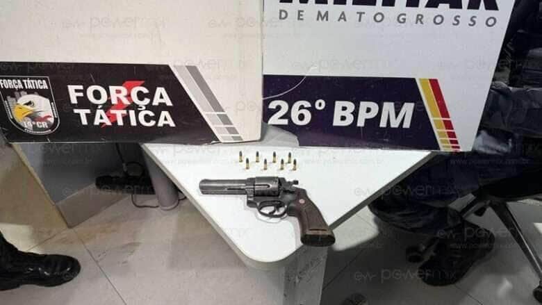 Com autorização do próprio suspeito, os policiais realizaram buscas dentro da residência. Durante a varredura, foi localizada uma arma de fogo tipo revólver calibre 38, da marca Rossi, escondida dentro do guarda-roupas. Além da arma, foram encontradas oito munições intactas calibre 22.