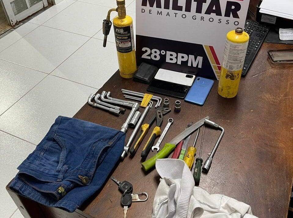 Os militares conseguiram fazer abordagem do carro próximo a entrada da cidade, na Avenida Pajé, em frente a um outro posto de combustível. Com um dos suspeitos, foi encontrado um alicate e várias chaves tipo boca em seu bolso. No veículo, os policiais encontraram várias ferramentas e dois maçaricos.