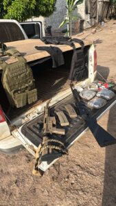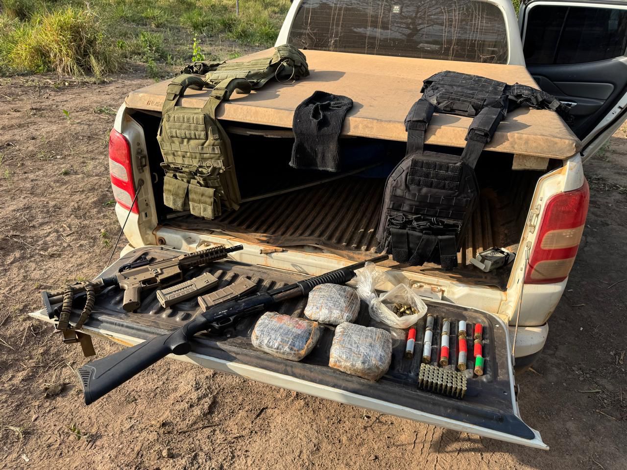 Entre os materiais apreendidos estavam um fuzil calibre 5,56 mm, uma espingarda calibre 12, dois coletes balísticos, diversas munições de diferentes calibres e três tabletes de maconha.