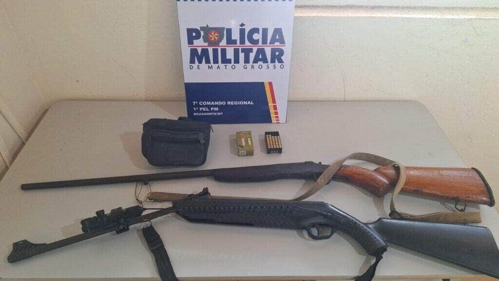 Equipes da Polícia Militar de Brasnorte prenderam dois homens, de 54 e 70 anos, por porte ilegal de arma e embriaguez ao volante, em duas ocorrências registradas na tarde deste sábado (06.04). Nas ações, foram apreendidas duas espingardas, um revólver e munições para as armas.