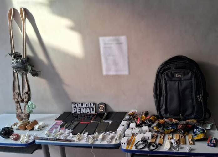 Durante as buscas nas proximidades da cadeia, os policiais localizaram, abandonada no quintal de uma residência próxima à unidade prisional, uma mochila contendo diversos materiais ilícitos. Entre os itens, destacam-se 14 celulares, 9 carregadores, 15 cabos USB e chips. O pacote também continha uma extensão elétrica, dois pedaços de serra, um alicate de corte profissional, três armas artesanais, 340 gramas de maconha, uma porção de cocaína e 16 pacotes de fumo.