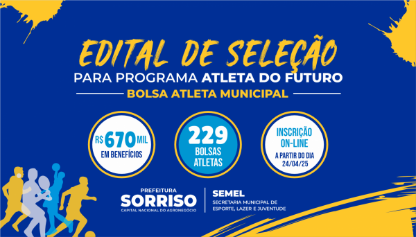 A Prefeitura de Sorriso, por meio da Secretaria Municipal de Esporte e Lazer (SEMEL), tem uma excelente notícia para os estudantes/atletas. Está aberto o edital de Chamamento Público n.° 001/2025 do “Programa Atletas do Futuro – Bolsa Atleta”, que vai conceder apoio financeiro para incentivar o desenvolvimento esportivo no Município.