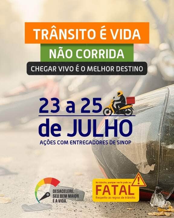 Com o tema “Trânsito é vida, não corrida”, a Prefeitura de Sinop, por meio da Secretaria de Segurança e Trânsito, realiza, entre os dias 23 (quarta-feira) e 25 (sexta-feira), uma campanha de conscientização sobre a segurança no trânsito, com foco nos entregadores por aplicativo e motociclistas. O objetivo é fomentar, entre os motociclistas, a importância de manter a segurança pessoal e mútua, enquanto utiliza as vias públicas para execução do trabalho.