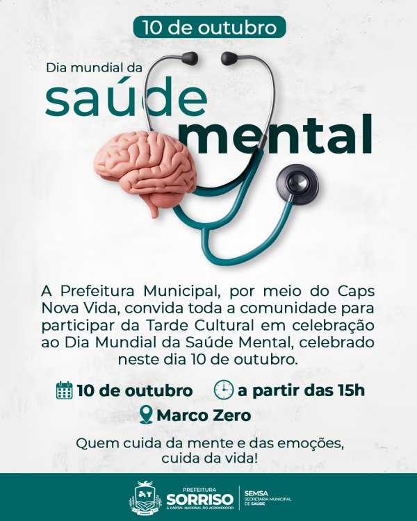 Nesta sexta-feira, 10, em que se celebra o Dia Mundial da Saúde Mental, a equipe do Centro de Atenção Psicossocial (Caps) Nova Vida de Sorriso preparou uma Tarde Cultural cheia de apresentações culturais e atividades de integração. O evento acontecerá a partir das 15h, no Marco Zero, e é aberto a toda a comunidade.