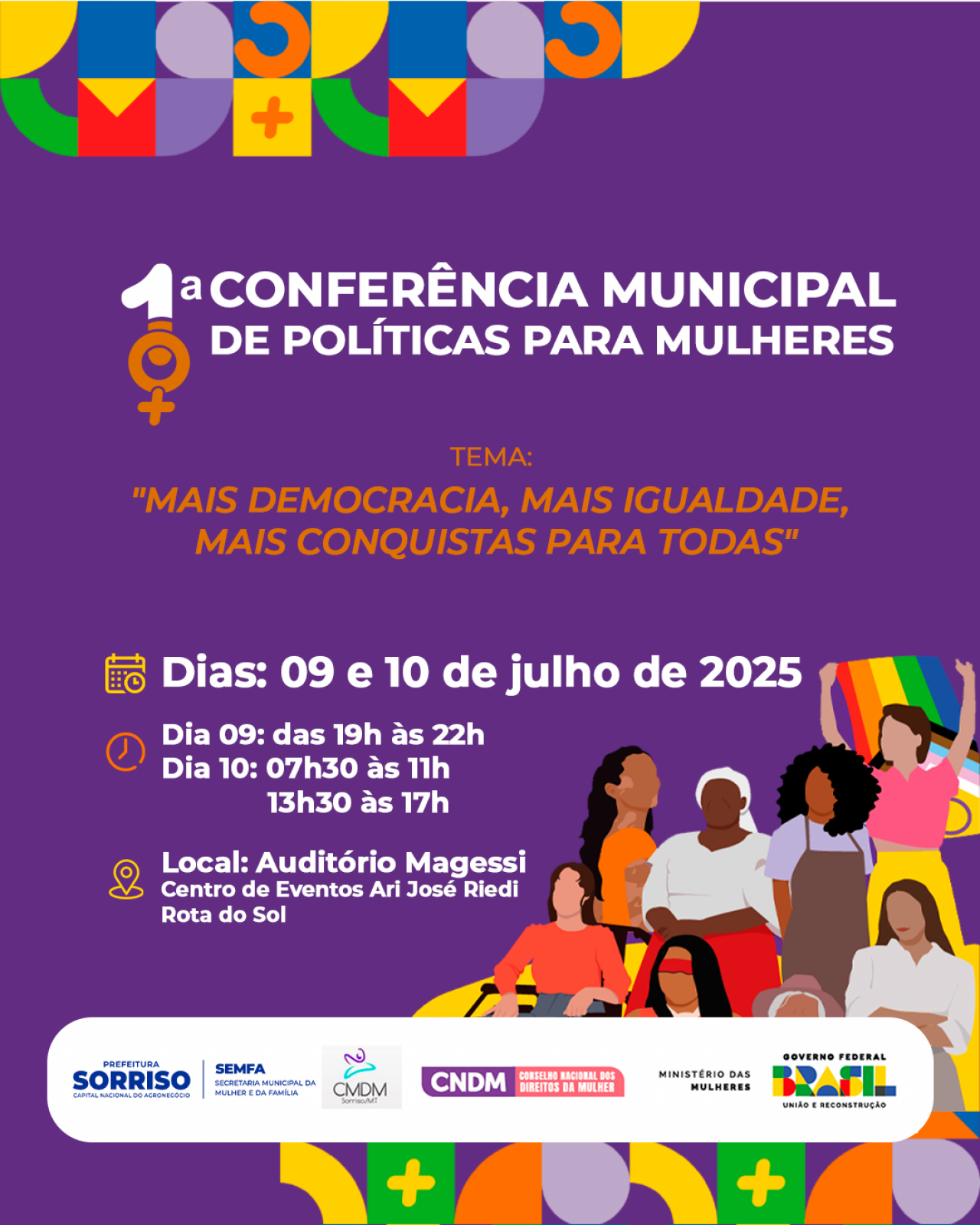 Por “Mais Democracia, Mais Igualdade, Mais Conquistas para Todas”. Esse é o tema central da 1.ª Conferência Municipal de Políticas para as Mulheres que será realizada em Sorriso entre os dias 09 e 10 de julho. Conforme a primeira-dama e gestora da Secretaria da Mulher e da Família (Semfa), Mara Fernandes, a conferência é um espaço fundamental de participação democrática e construção coletiva.