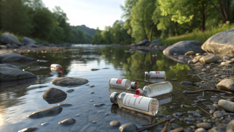 Os frascos foram encontrados na sexta-feira (22) durante uma ação de limpeza urbana, com parte do material submersa no córrego e outra espalhada às margens, entre a vegetação protegida. O descarte irregular representa risco à saúde pública, ao meio ambiente e aos recursos hídricos.