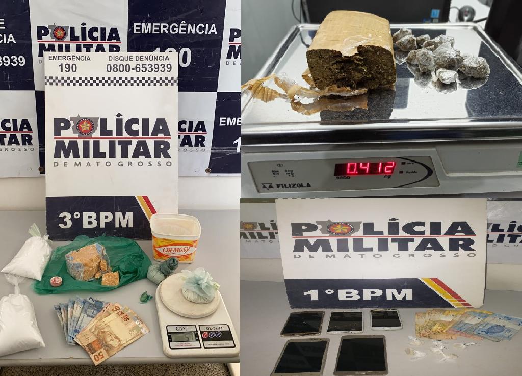 Em Cuiabá, no residencial Aroeira, os militares do 3º BPM foram informados que um homem estaria traficando na região. Na abordagem, o suspeito carregava uma pedra de pasta base de cocaína. Em sua casa os agentes encontraram mais porções de cocaína, pasta base, ácido bórico, uma balança e dinheiro.