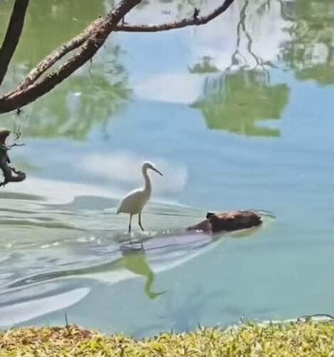 Enquanto a capivara atravessava uma área alagada, a garça aproveitava para descansar as asas e manter os pés secos. E por incrível que pareça, esse comportamento não é raro na natureza: muitos animais desenvolvem relações de convivência curiosas, seja por necessidade ou pura praticidade.