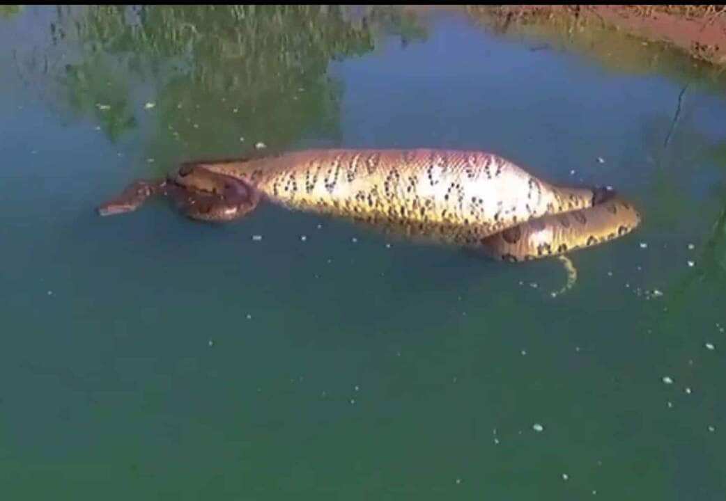 Um grupo de pescadores tiveram uma surpresa e tanto, ao visualizarem uma cobra sucuri com uma barriga enorme, jiboiando dentro de um rio.