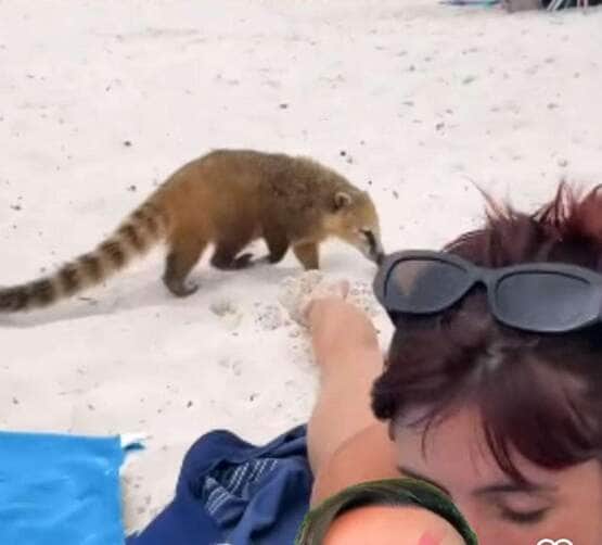 Quati engraçadinho rouba a cena em praia brasileira; ladrão de sanduíches!