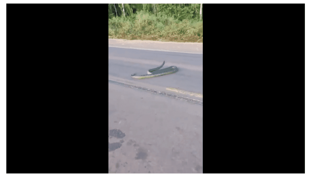 No vídeo, uma cobra sucuri aparece em meio a uma rodovia e uma pessoa que passa pelo local, tenta retirar a anaconda para não ser atropelada.