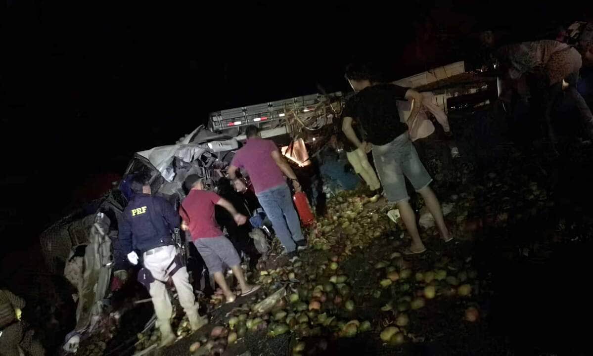 Acidente entre ônibus e caminhão deixou 25 pessoas mortas e cinco feridas, na noite desse domingo (7) na BR-324, em São José do Jacuípe, no norte da Bahia. Foto: Brigada Anjos Jacuipenses