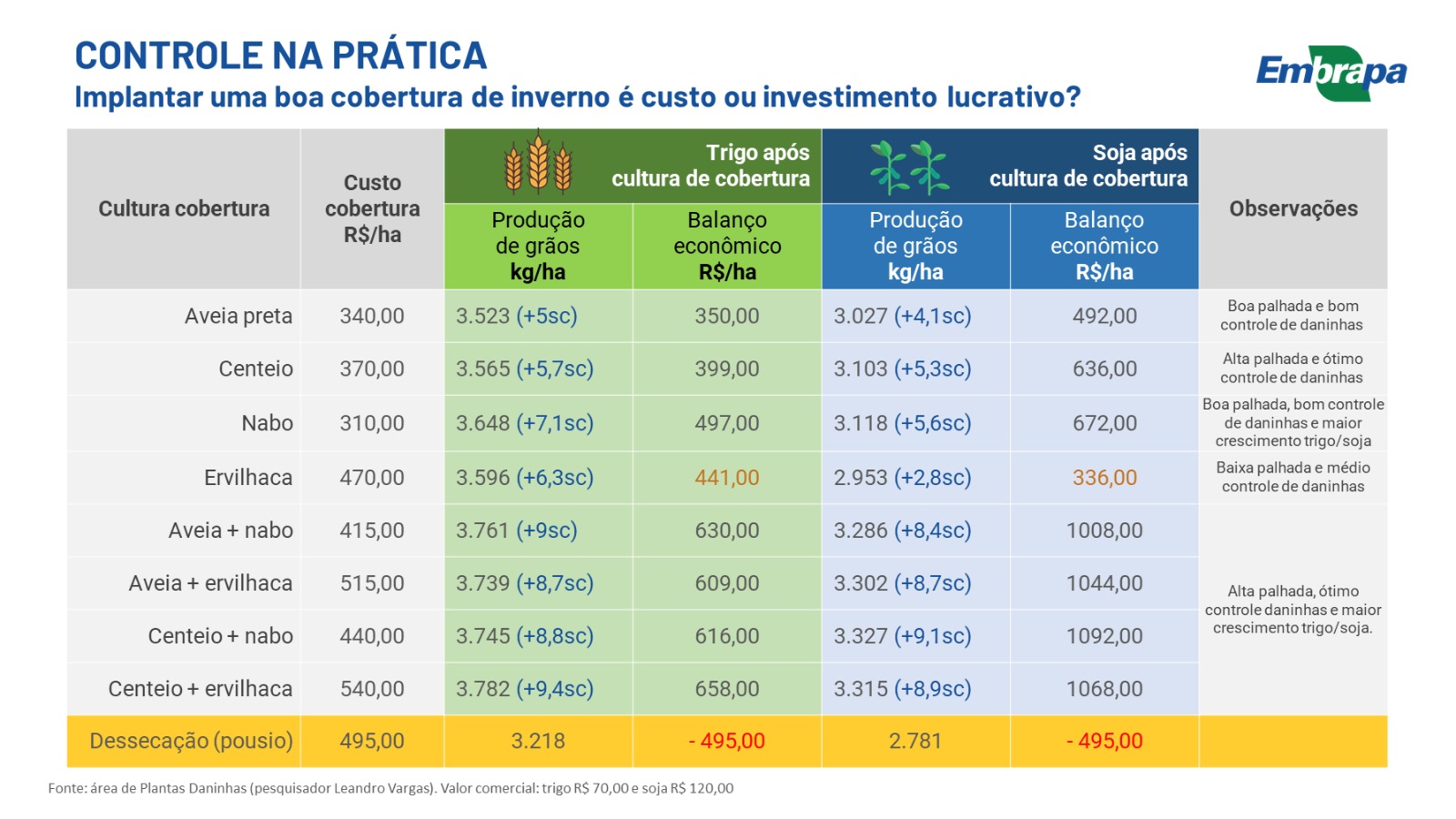 A área mantida em pousio, utilizada como testemunha, apresentou custo de R$ 495,00 por hectare devido à necessidade de duas aplicações de herbicidas na dessecação para controle de plantas daninhas. Nesse sistema, a produtividade de grãos foi inferior, resultando em balanço econômico negativo de –R$ 495,00 em função das dificuldades de controle das plantas daninhas na pré-semeadura tanto do trigo como da soja.