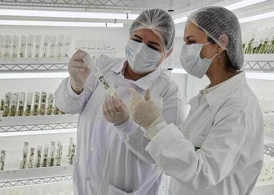 Sarita Meireles e Larissa Vendrame, da Embrapa, analisam mudas da batata-doce BRS Anembé, próximo material a ser analisado no espaço, após o grão-de-bico BRS Aleppo. Foto: Paula Rodrigues