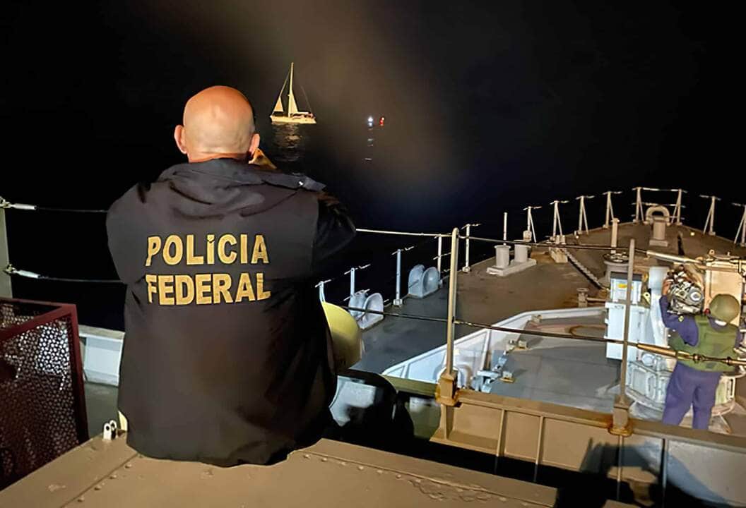 Quatro policiais federais embarcados no navio-patrulha Guaratuba, da Marinha, fizeram a abordagem na tarde desta sexta-feira (10) ao veleiro Kiel, de bandeira alemã. A nacionalidade dos tripulantes presos não foi informada.