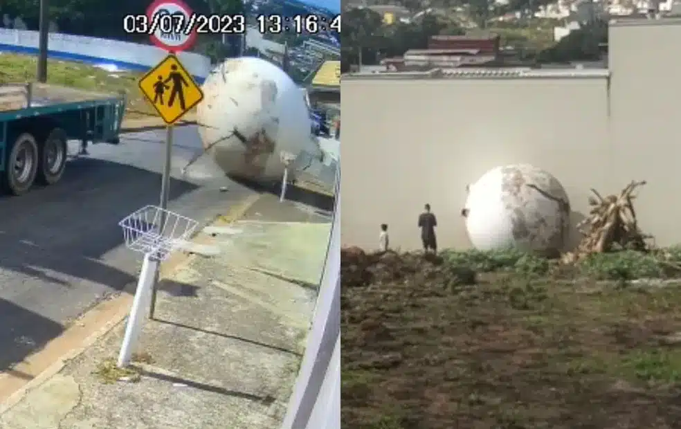 Na imagem registrada por uma câmera de segurança, é possível ver o momento em que o tanque se desprendeu do caminhão e caiu na rua. O objeto saiu “rolando” e quase atingiu o muro de uma casa.