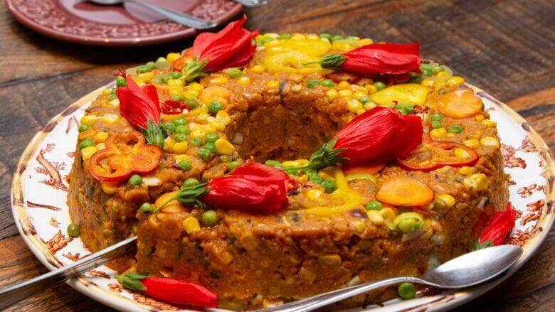 - Desenforme o cuscuz sobre um prato grande e polvilhe com a salsinha e a cebolinha picadas.