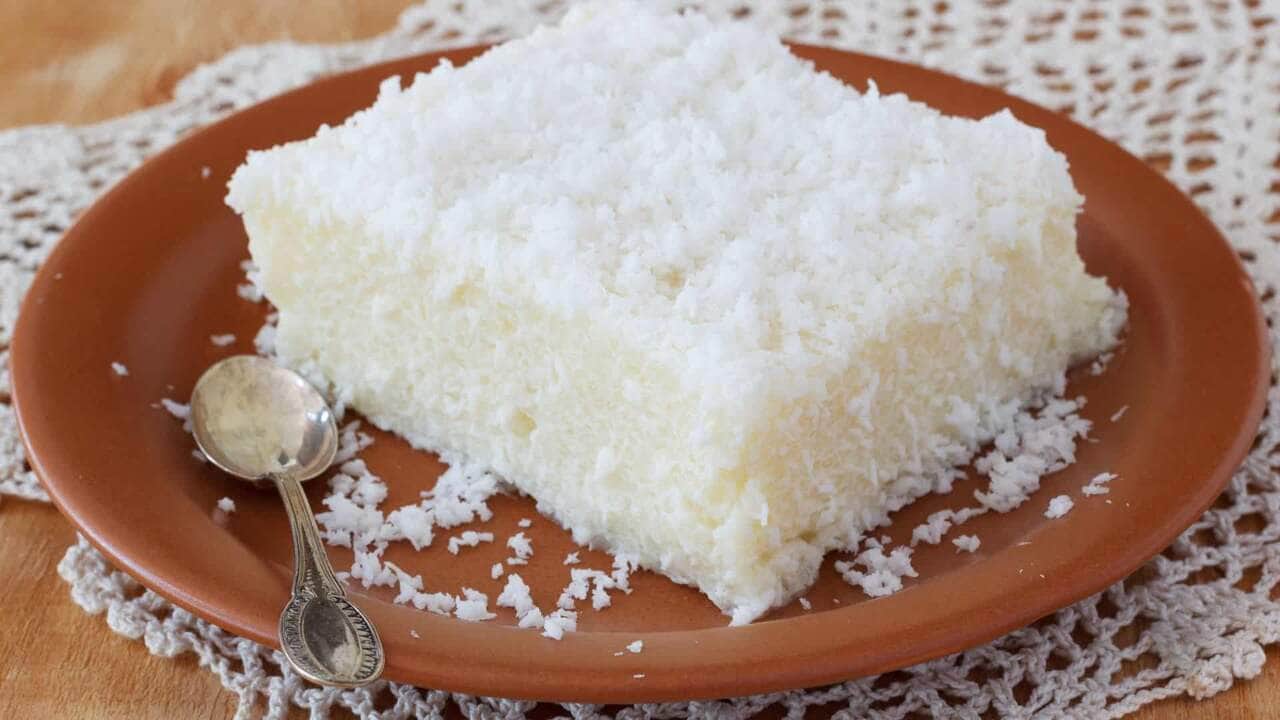 10. Passado o tempo de geladeira, desenforme o cuscuz em um prato de servir e decore com coco ralado por cima.