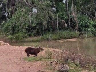 Onça-pintada tenta pegar capivara, mas leva banho de realidade