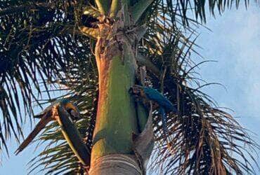 Araras-canindés colorem o céu de Lucas do Rio Verde e encantam moradores em pleno voo