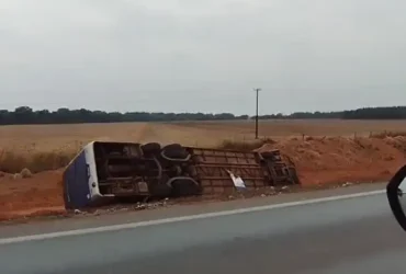 Ônibus colide com carreta e tomba na BR-163 em Nova Mutum