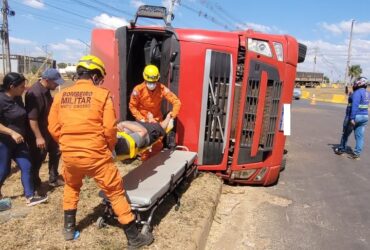 Carreta tomba em rotatória da Galinha Preciosa e motorista fica ferido em Lucas do Rio Verde