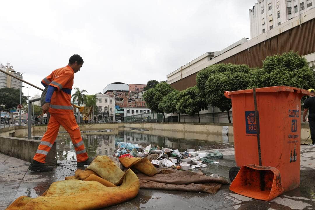 Garis recolhem lixo no sítio arqueológico do Cais do Valongo, na região portuária, alagado depois das chuvas. Por: Tânia Rêgo/Agência Brasil