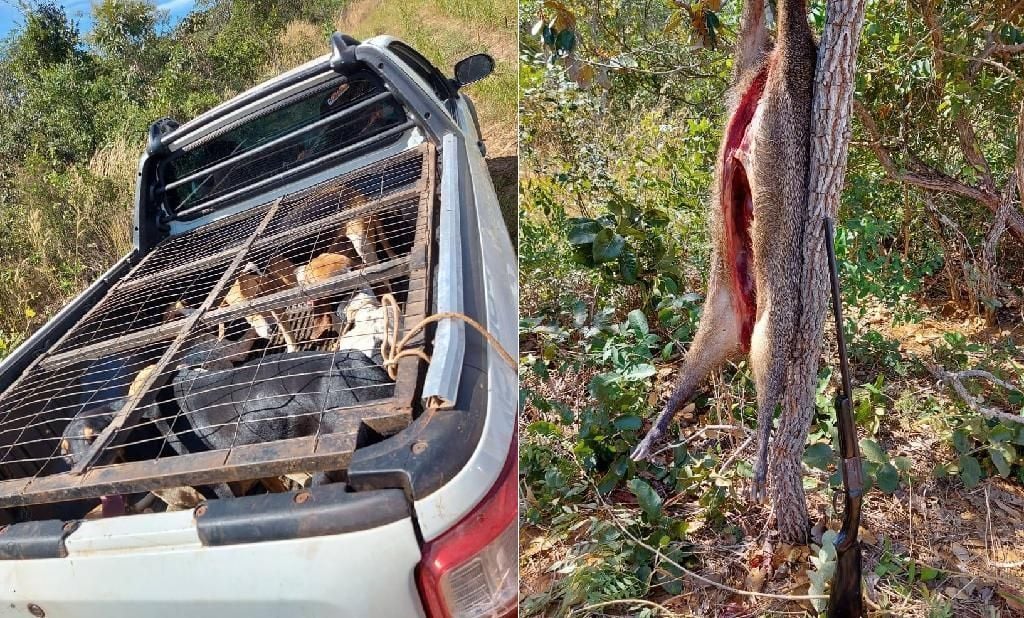 Além do veículo, eles abandonaram seis cachorros que estavam em uma gaiola, um cateto abatido, um revólver calibre 22, com 49 munições, uma espingarda calibre 36, com sete munições, duas facas e dois rádios comunicadores. Um dos homens foi identificado pelo RG deixado no local.