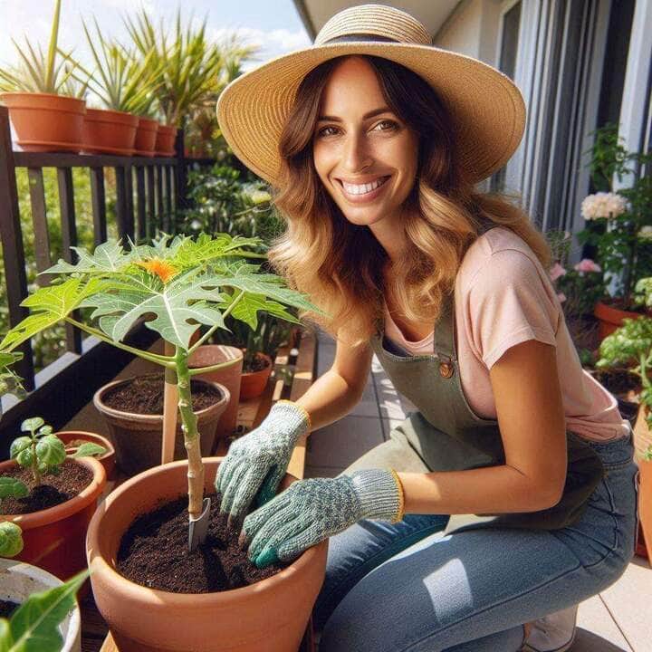 Atenção! Se o vaso for pequeno, a planta terá que ser transplantada para a terra para que o mamoeiro se desenvolva bem. O ideal é escolher um vaso de 100 litros com boa adubação. Se você tiver um espaço que permita plantar diretamente no solo, melhor ainda!