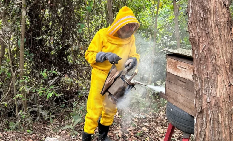 O pesquisador também destacou como foi a oficina prática, realizada no apiário: “Na oficina prática, como a gente pensou na questão de doenças, a gente tentou mostrar para o produtor como o médico veterinário atua na identificação de doenças e na coleta de material, para que ele esteja sintonizado com o médico veterinário, principalmente o veterinário do serviço oficial de sanidade que é o INDEA, de tal modo que ele tenha consciência do que o médico veterinário vai fazer, que tipo de material ele vai coletar, como ele vai coletar e quais os procedimentos que o produtor pode desenvolver durante esse processo de coleta de material, de tal modo para tornar o serviço veterinário mais eficiente na coleta, quais os pontos que o médico veterinário olha como suspeita e com isso, acaba estimulando o produtor a informar o veterinário durante a abordagem que algumas situações na colmeia não estão dentro da normalidade. Uma vez que o apicultor desenvolve a atividade diuturnamente e o serviço sanitário oficial tem a capacidade de abordar e tentar estabelecer o diagnóstico preciso dos quadros de doença, mas não tem o que o produtor tem: que é a rotina diuturna de trabalho com as abelhas, essa vivência prática do apicultor é muito importante para visualizar possíveis quadros que possam ser caracterizados como doenças”. Salientou o professor Afonso.