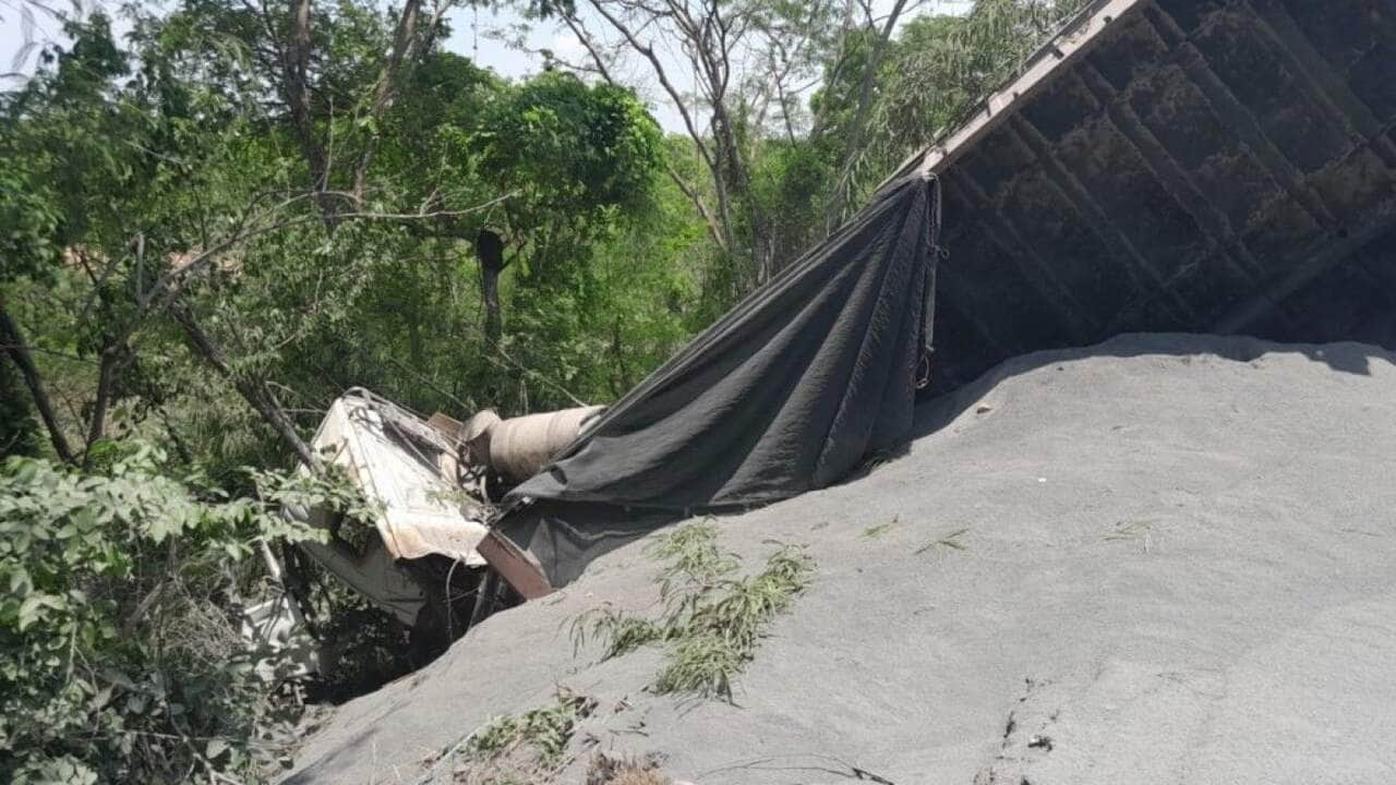 Um caminhão que pertence uma empresa de concreto usinado caiu em uma ribanceira, sendo que a cabine separou do chassi do veículo.