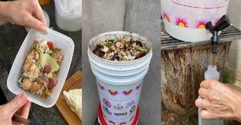 Conforme Thaynara, a composteira é usada para colocar o material orgânico e as mulheres estão usando balde de plástico com tampa. São três baldes, devidamente numerados. Os dois primeiros recebem os resíduos, enquanto terceiro recolhe o líquido da decomposição produzido no processo, conhecido por chorume, um fertilizante caseiro.