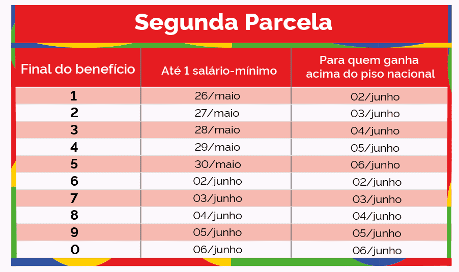 O objetivo é permitir que os beneficiários paguem suas contas, comprem remédios, façam a compra do mês e supram necessidades básicas com mais tranquilidade. Pelo cronograma anunciado pelo Ministério da Previdência Social, a primeira metade será paga entre 24 de abril e 8 de maio. O grupo prioritário é composto por beneficiários que recebem até um salário-mínimo (R$ 1.518). O segundo grupo – quem ganha acima do piso nacional – terá o benefício creditado entre 2 e 8 de maio. O INSS programou o pagamento da segunda parcela do adiantamento entre os dias 26 de maio e 6 de junho. ( confira infográficos ).