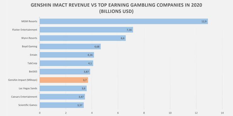 O terceiro gráfico compara a receita do desenvolvedor miHoYo com as principais empresas de jogos de azar. Embora o estúdio chinês não consiga igualar gigantes como o MGM Resorts, ele ainda ocupa o 8o lugar nos ganhos de 2020. Um gráfico mostrando outros desenvolvedores e editores de jogos também pode ter sido relevante, mas a comparação ainda é interessante.