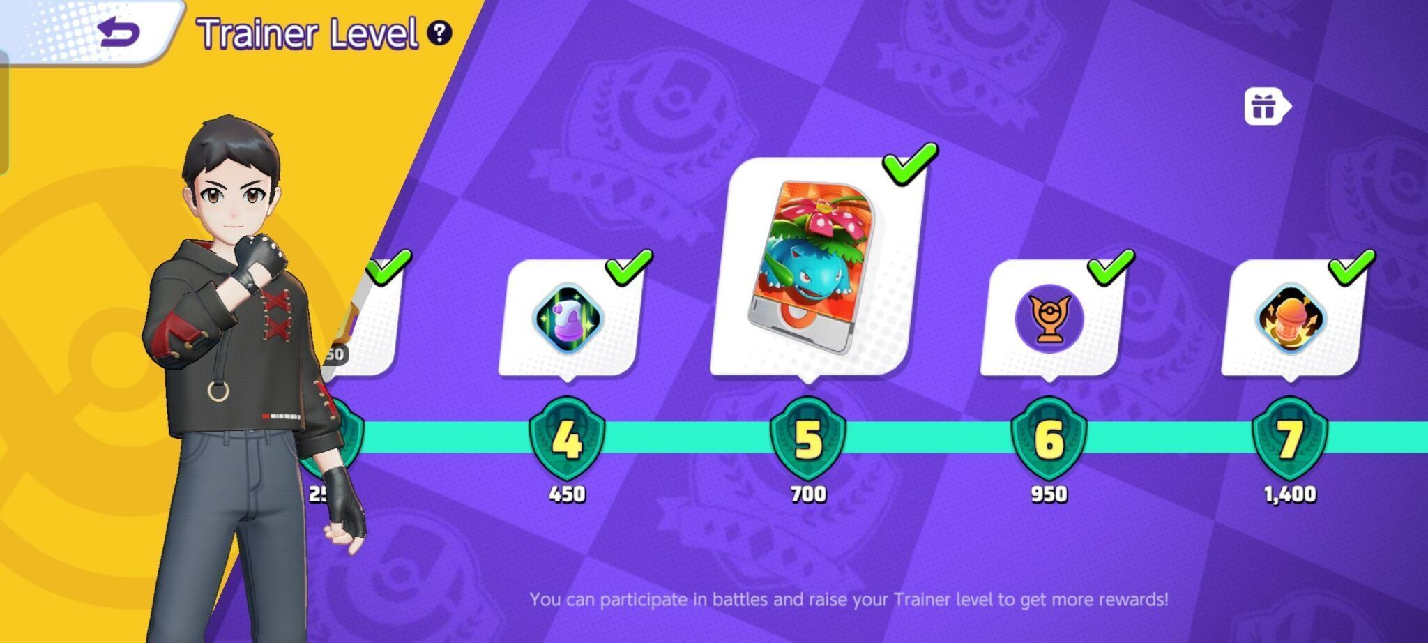 Como recompensa de nível de treinador, Venusaur estará disponível para reivindicação assim que você atingir o nível cinco. Quando você atingir o nível cinco, vá até o menu de nível superior esquerdo do treinador no canto inicial para desbloquear este temível acionador de partida de grama.